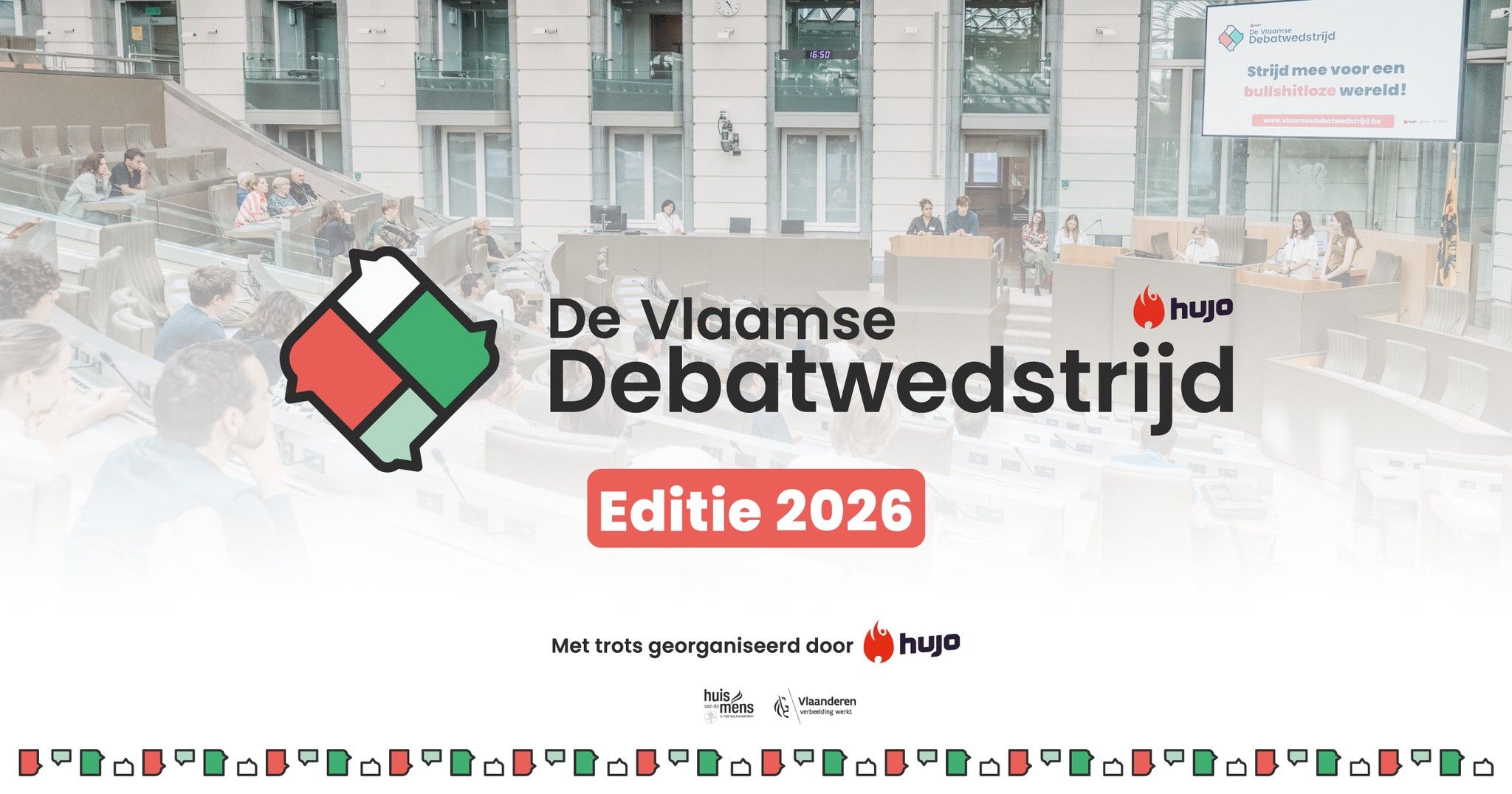 We zijn terug met een nieuwe superspannende editie van De Vlaamse Debatwedstrijd! Stel je straffe team van 2 personen samen en ga de challenge aan op een voorronde bij jou in de buurt. Strijd voor een plaats in de Grote Finale van de Vlaamse Debatwedstrijd en ga voor de overwinning! Voor jongeren uit het 4e, 5e en 6e middelbaar.